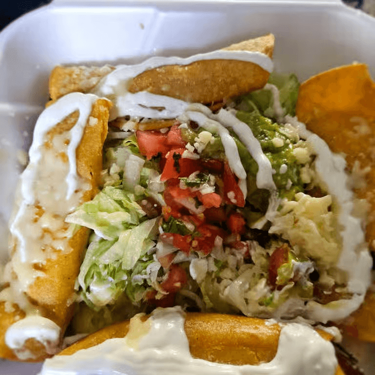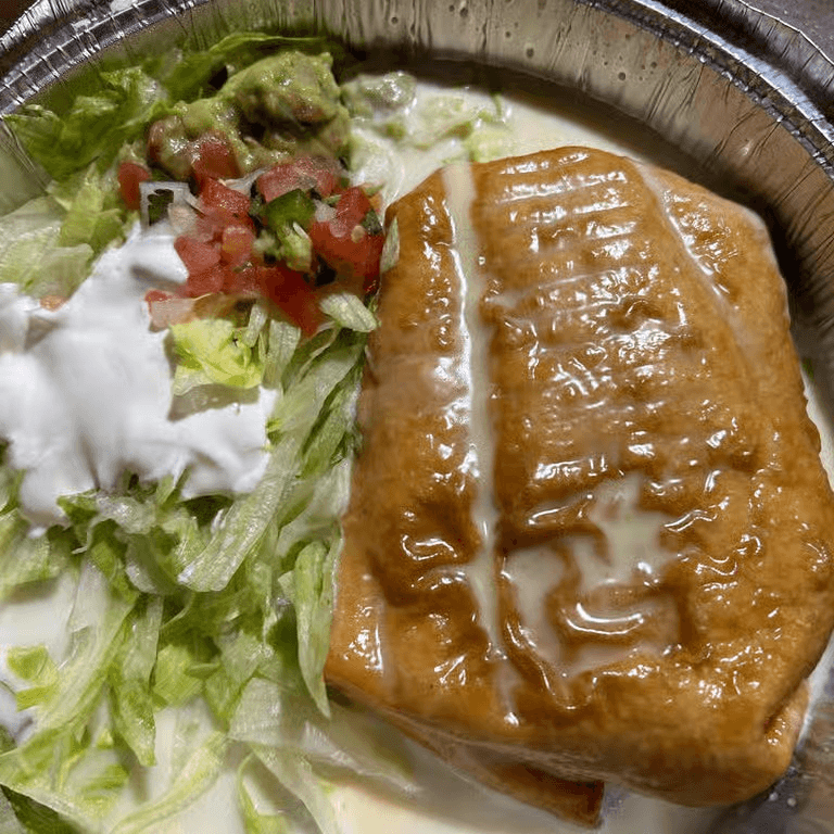 A flour tortilla stuffed with your choice of beef or spicy chicken, deep-fried to a golden brown, and topped with cheese sauce, lettuce, and guacamole
