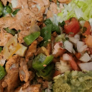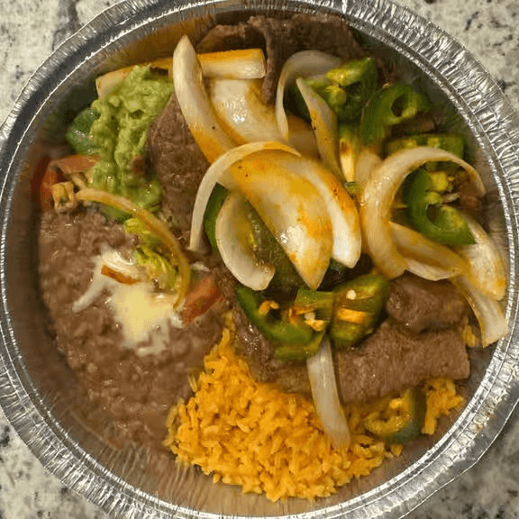 Your choice of meat, steak or chicken, with beans, rice, bell peppers, onions, cheese sauce, and guacamole