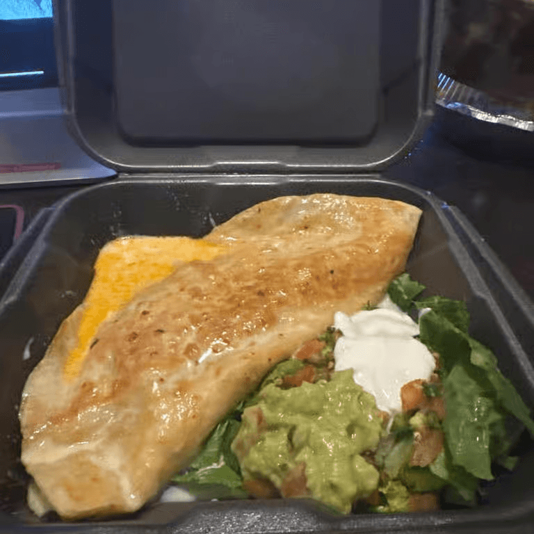 Huge 12" tortilla stuffed with grilled chicken, or steak, and cheese. Served with sour cream, lettuce, and topped with cheese sauce