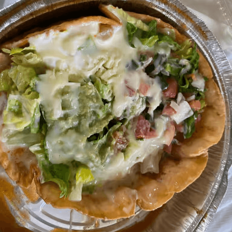 Crispy flour tortilla filled with your choice of beef or chicken and melted cheese sauce topped with lettuce, guacamole, sour cream, and tomatoes