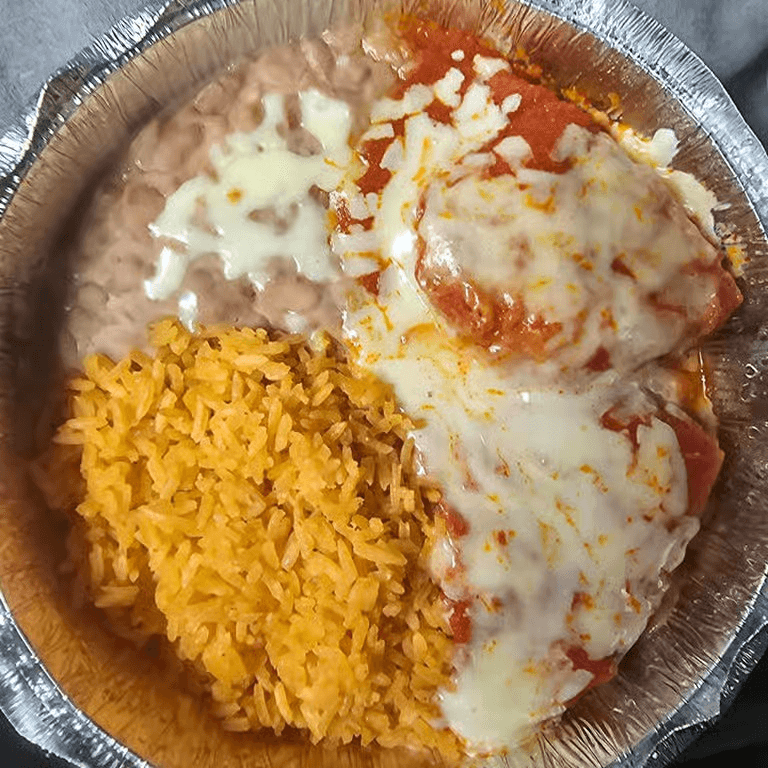 Bean burrito, cheese enchilada, and rice
