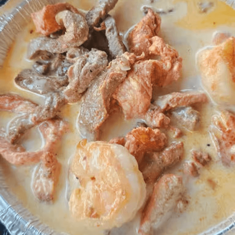 Chicken, steak, shrimp, cheese sauce, and tortilla