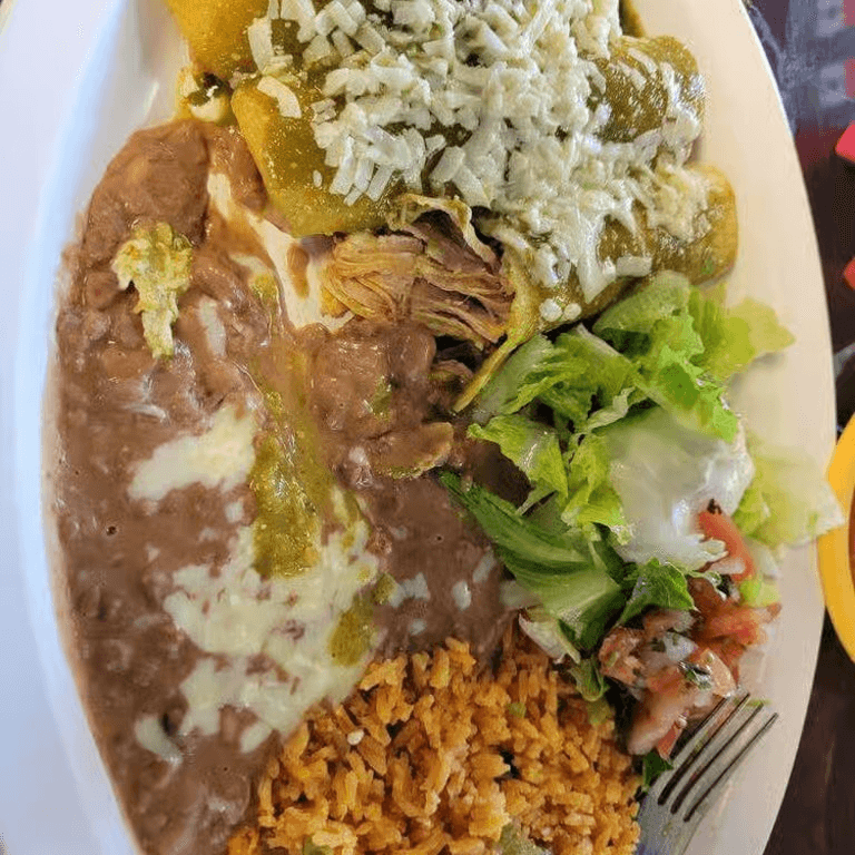 Four enchiladas of chicken or potatoes, salsa guajillo, jalapeño, cabbage, Mexican cheese, oregano, onions and sour cream