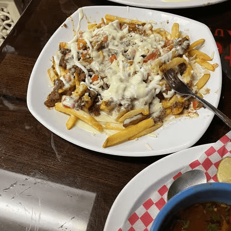 Fries, topped with ground beef. White cheese, sauce, jalapeños, pico de gallo, and adorned with cilantro. Choice of ranch or sour cream