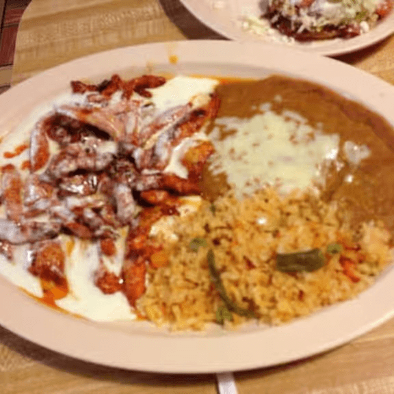 Your choice of meat, steak, or chicken. Corn tortillas cooked with steak, onions, eggs, and spicy green sauce. Topped with cheese, served with rice and guacamole salad