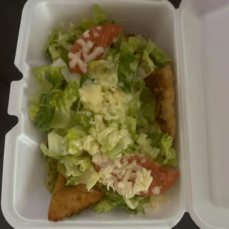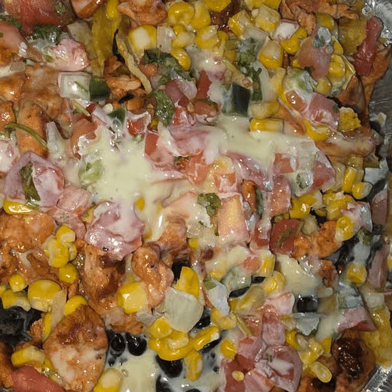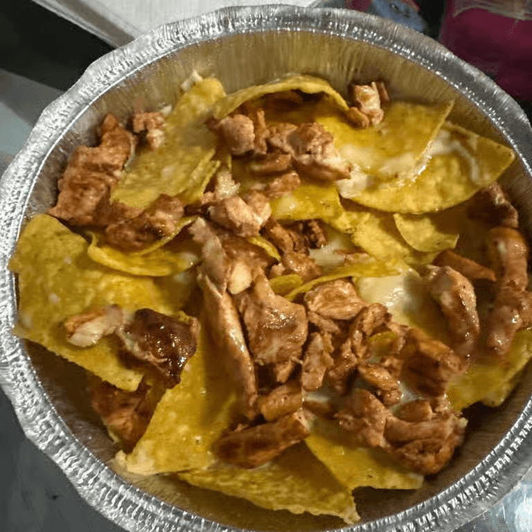 Grilled chicken or steak on a bed of tortilla chips with whole black beans, red onions, tomatoes, corn, and shredded cheese